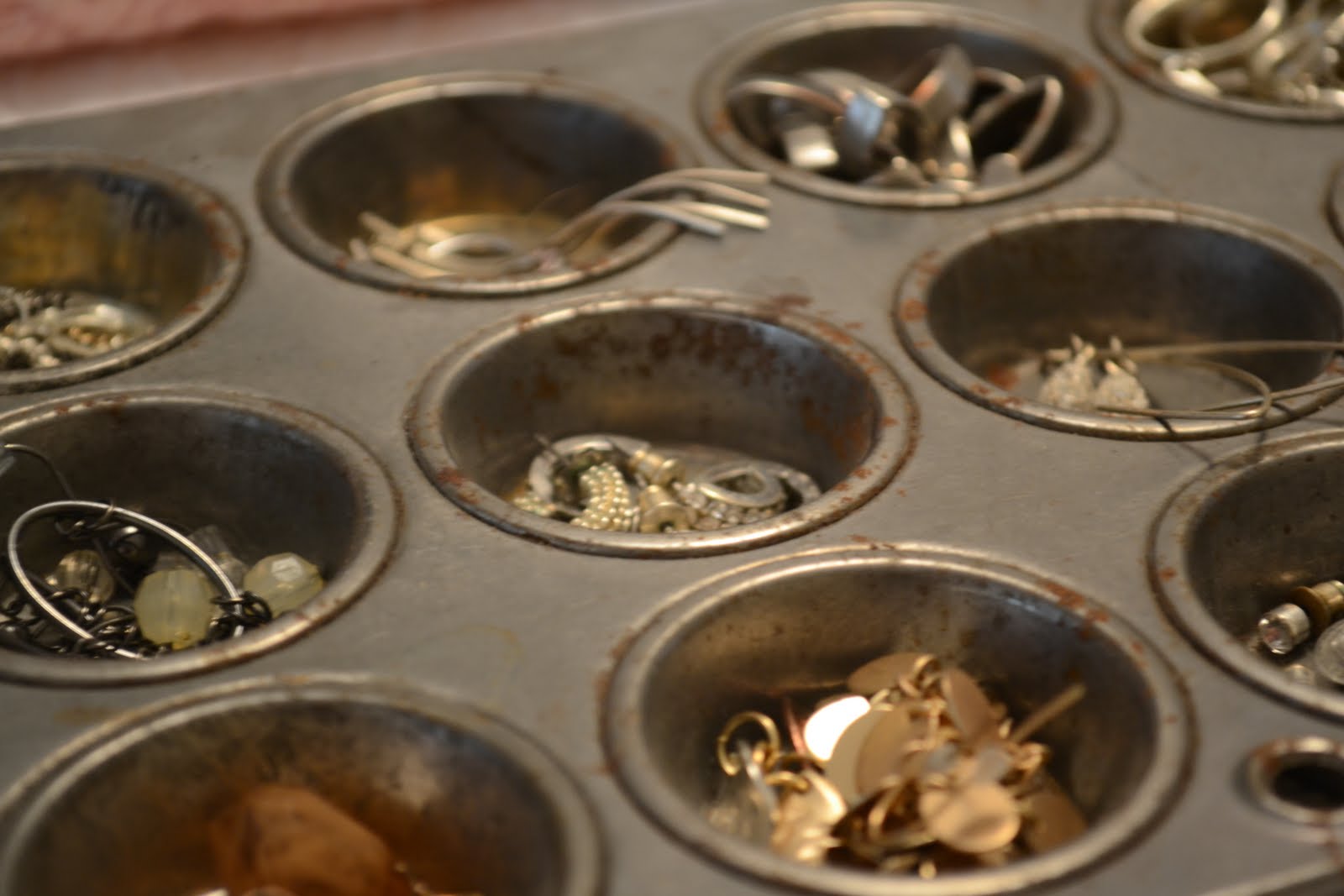 I organized my earrings and chain bracelets into this vintage tart pan. I think it looks cute!